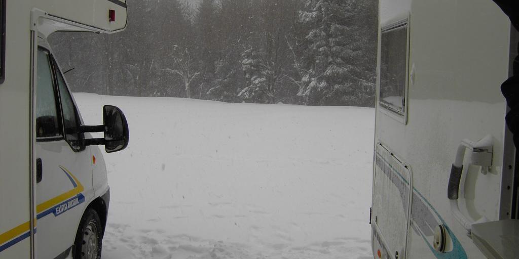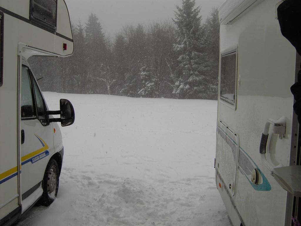 Es hatte die ganze Nacht über heftig gestürmt und geschneit. Am Morgen waren wir dann eingeschneit. Nach dem Frühstück sind wir noch mal kurz in den Ort gelaufen, haben uns dann aber kurzfristig entschieden doch lieber weiterzufahren, da es immer heftiger schneite und wir sonst nicht mehr weggekommen wären.