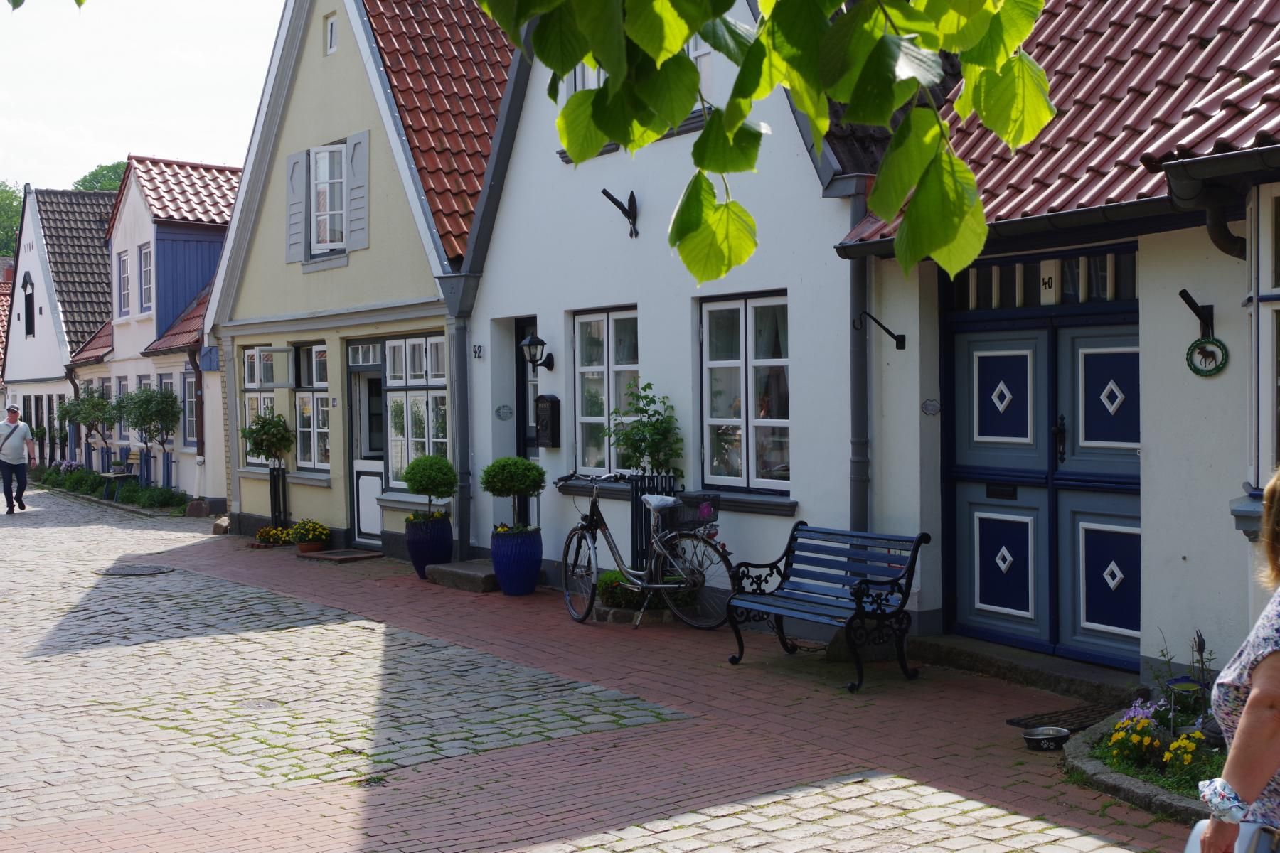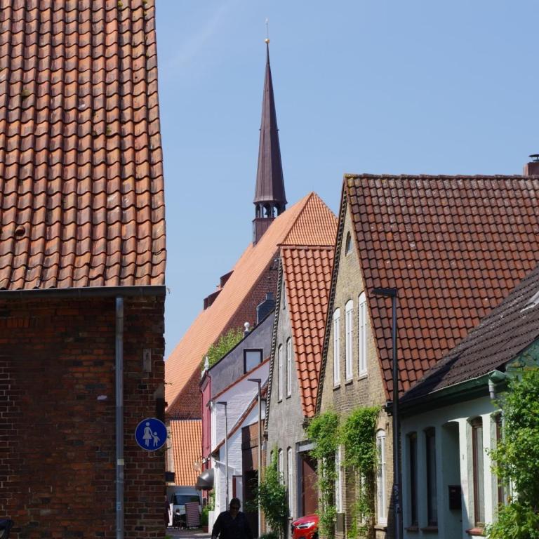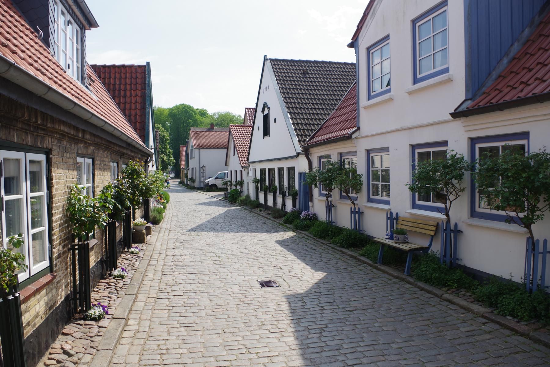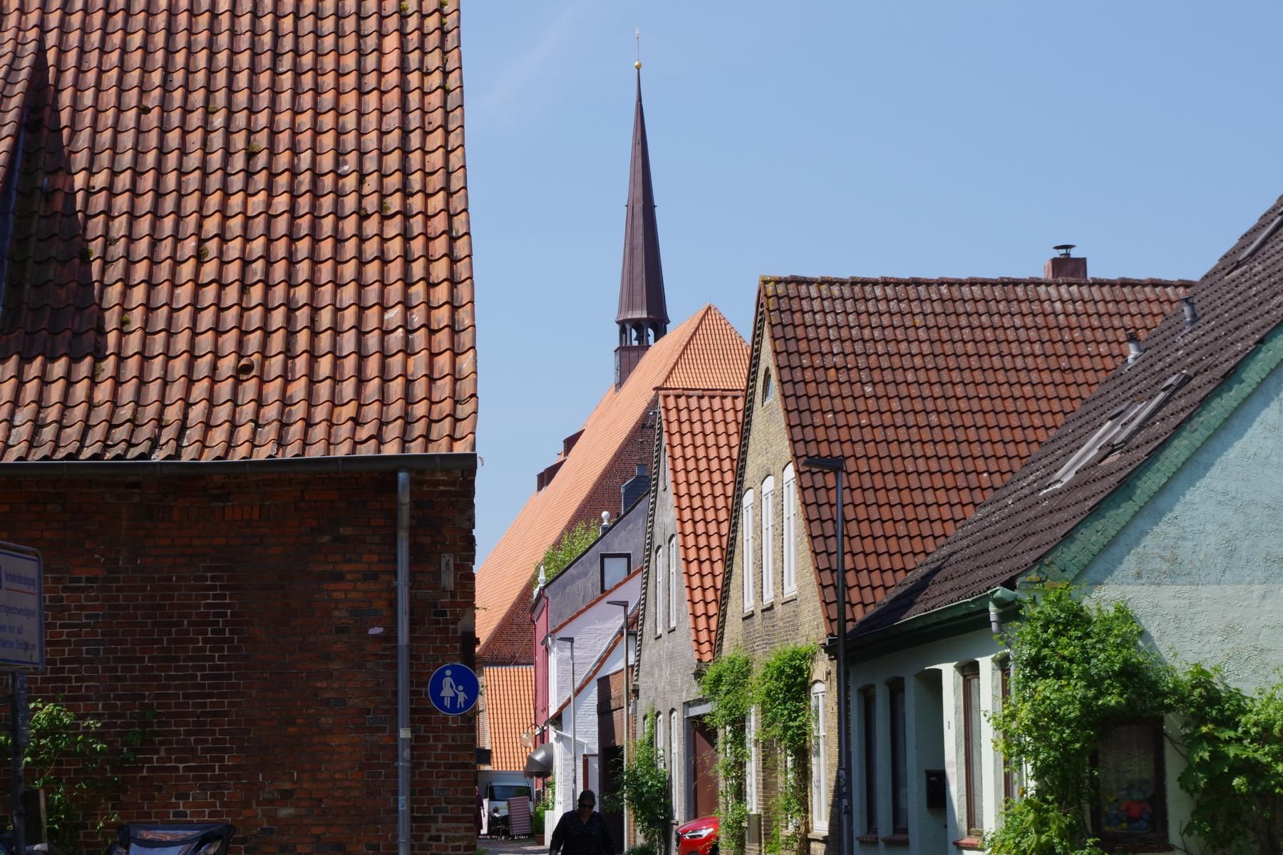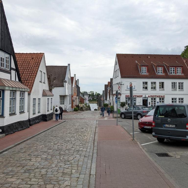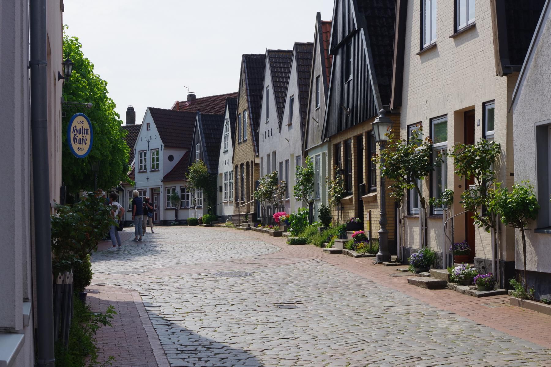 Bei bestem Wetter machten wir uns nach dem Frühstück auf nach Schleswig. Der Stadtteil Holm liegt direkt am Wasser am Rande von Schleswig. Eine wunderschöne kleine Fischersiedlung. In der Dorfmitte befindet sich eine kleine Kirche mit Friedhof. Hier werden heute noch die Einheimischen beerdigt. Parken kann man, wenn man einen Parkplatz findet, kostenlos am Hafen. Von hier aus sind es nur ca. 10 Minuten Fußweg nach Holm.