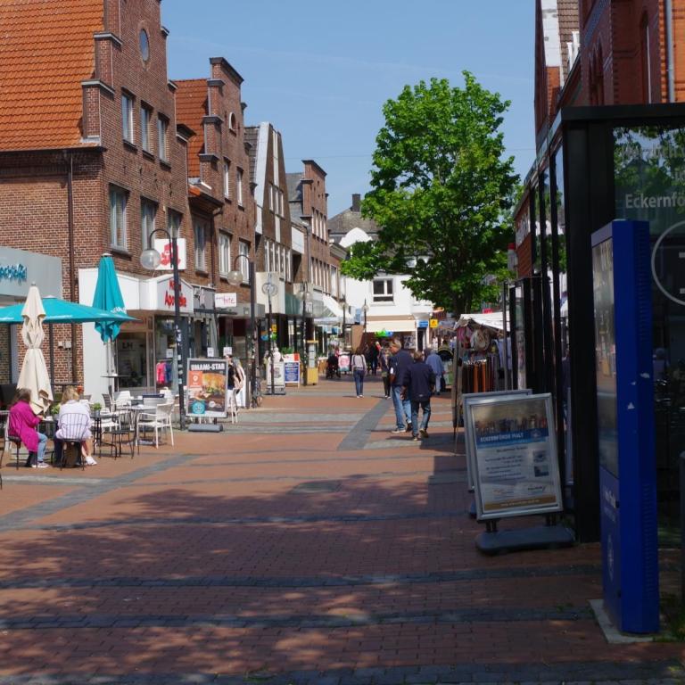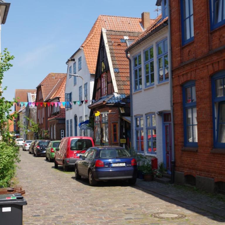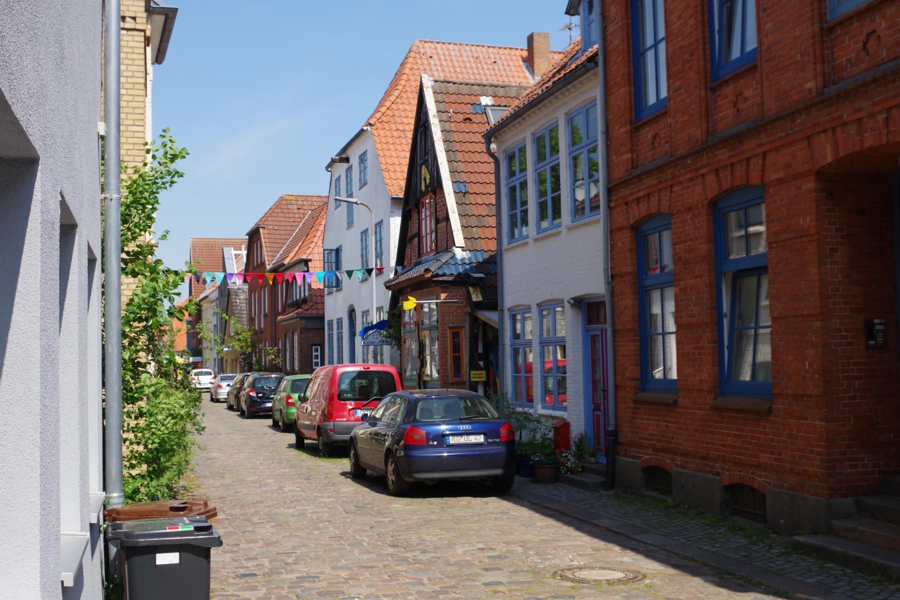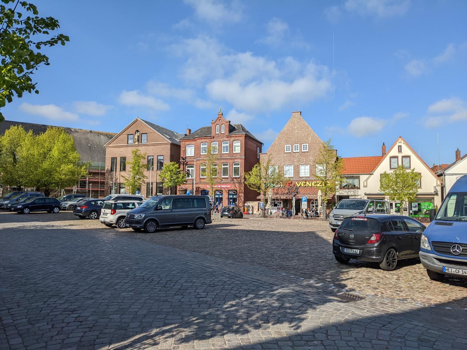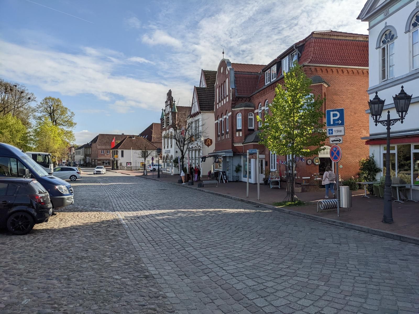 Die Stadtmitte von Schleswig gibt nicht viel her. Fußgängerzone mit vielen Geschäften und Cafés aber keine schönen Häuser. In der Stadtmitte unmittelbar an der Fußgängerzone gibt es ein großes kostenloses Parkhaus. Hier darf man 3 Stunden mit Parkscheibe parken.