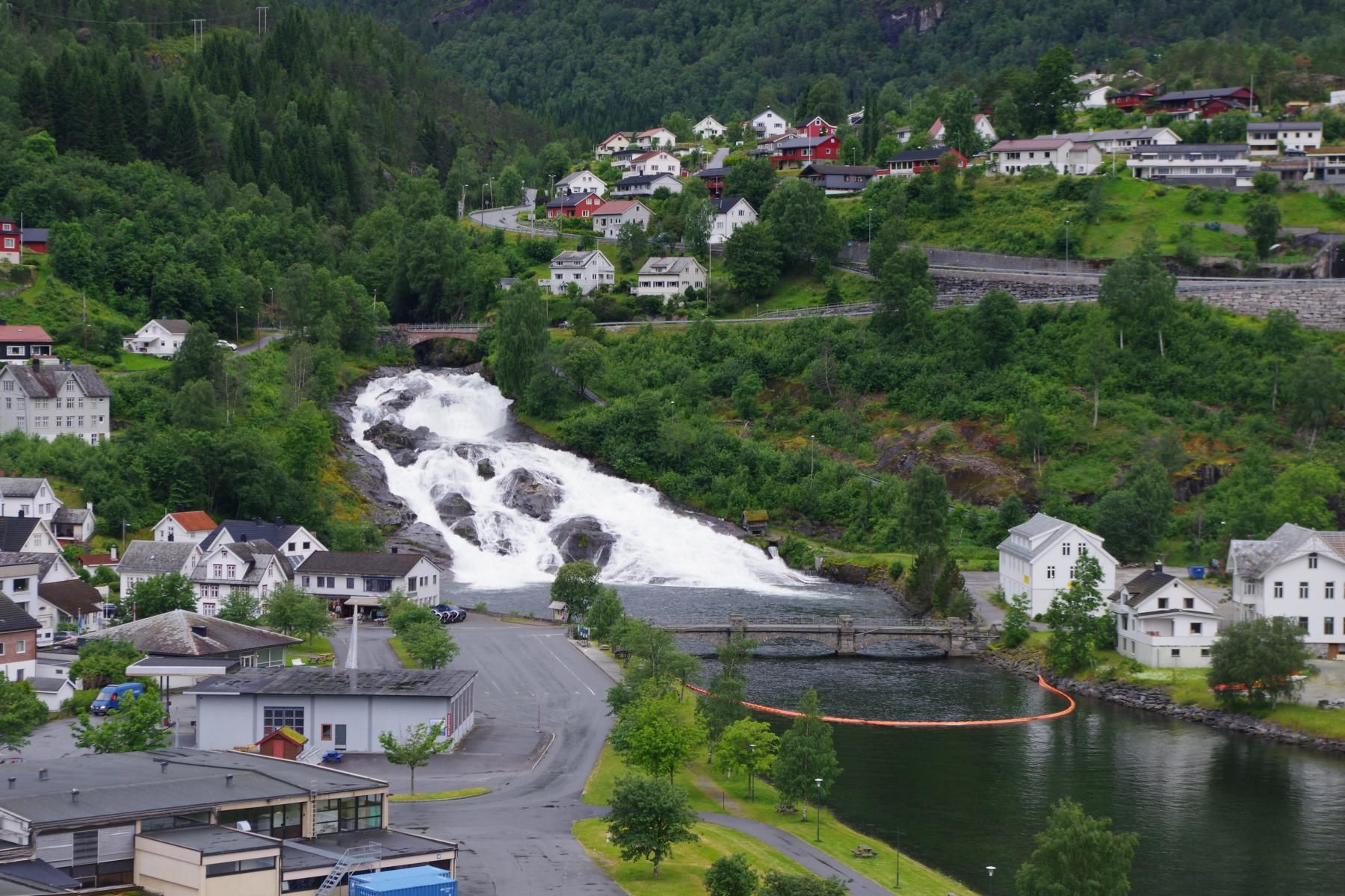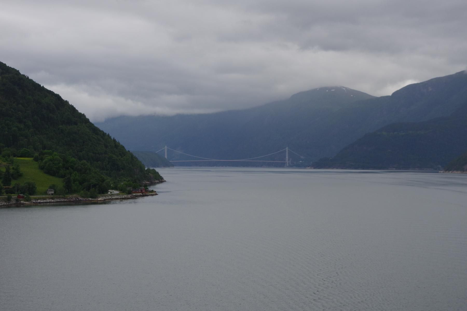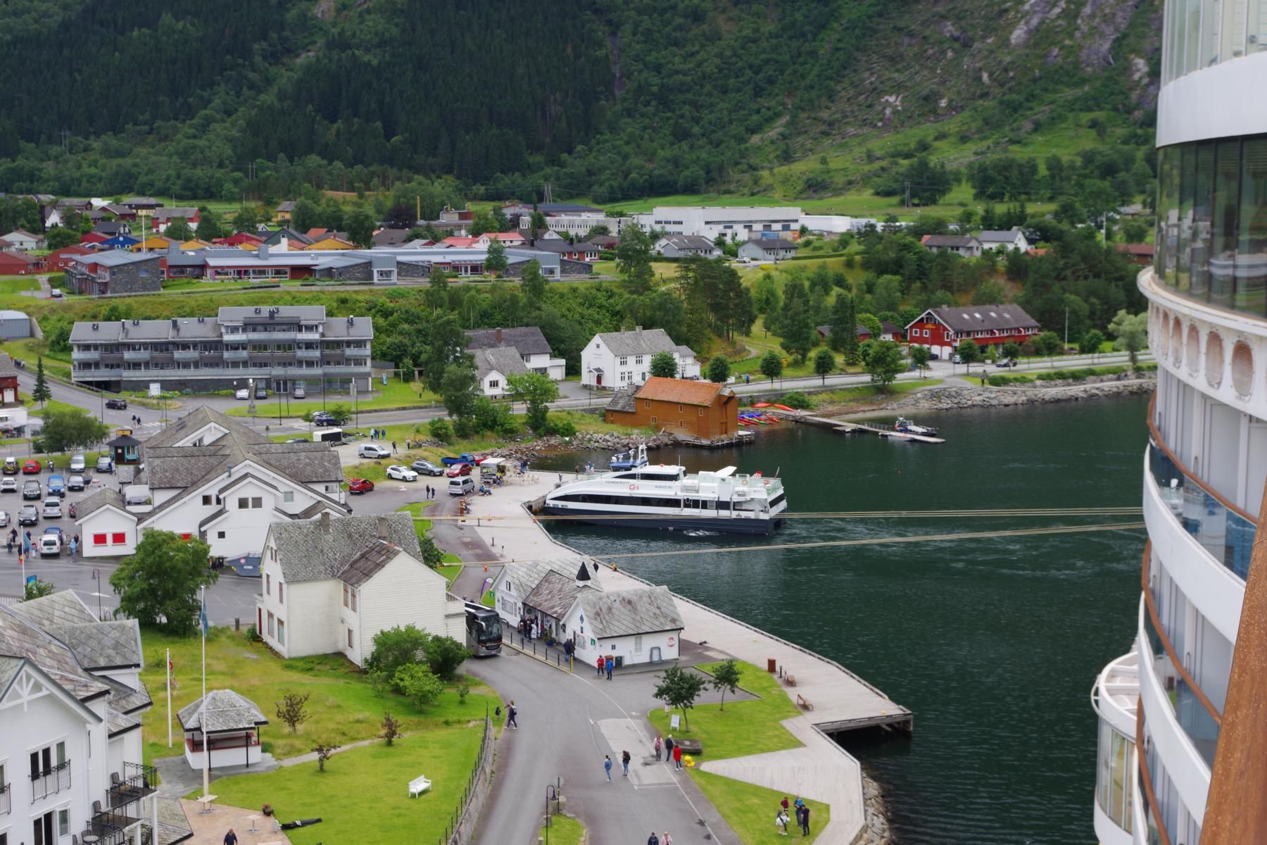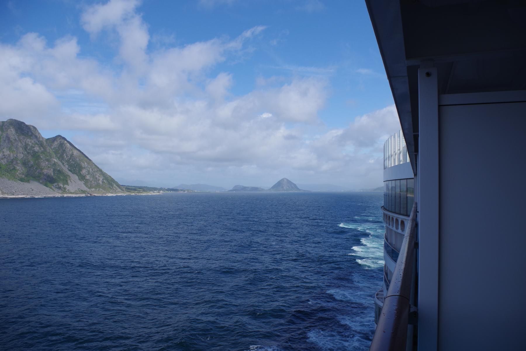 Als das Schiff gegen 14 Uhr wieder ausgelaufen ist, kam die Sonne raus. Man hätte besser die Reise mit einem längeren Aufenthalt in Alesund planen sollen. Die schöne Altstadt nur 10 Minuten Fußweg vom Schiff wäre es wert gewesen. Jetzt sind wir ca. 550 Km unterwegs bis zum nächsten Halt in Eidfjord.