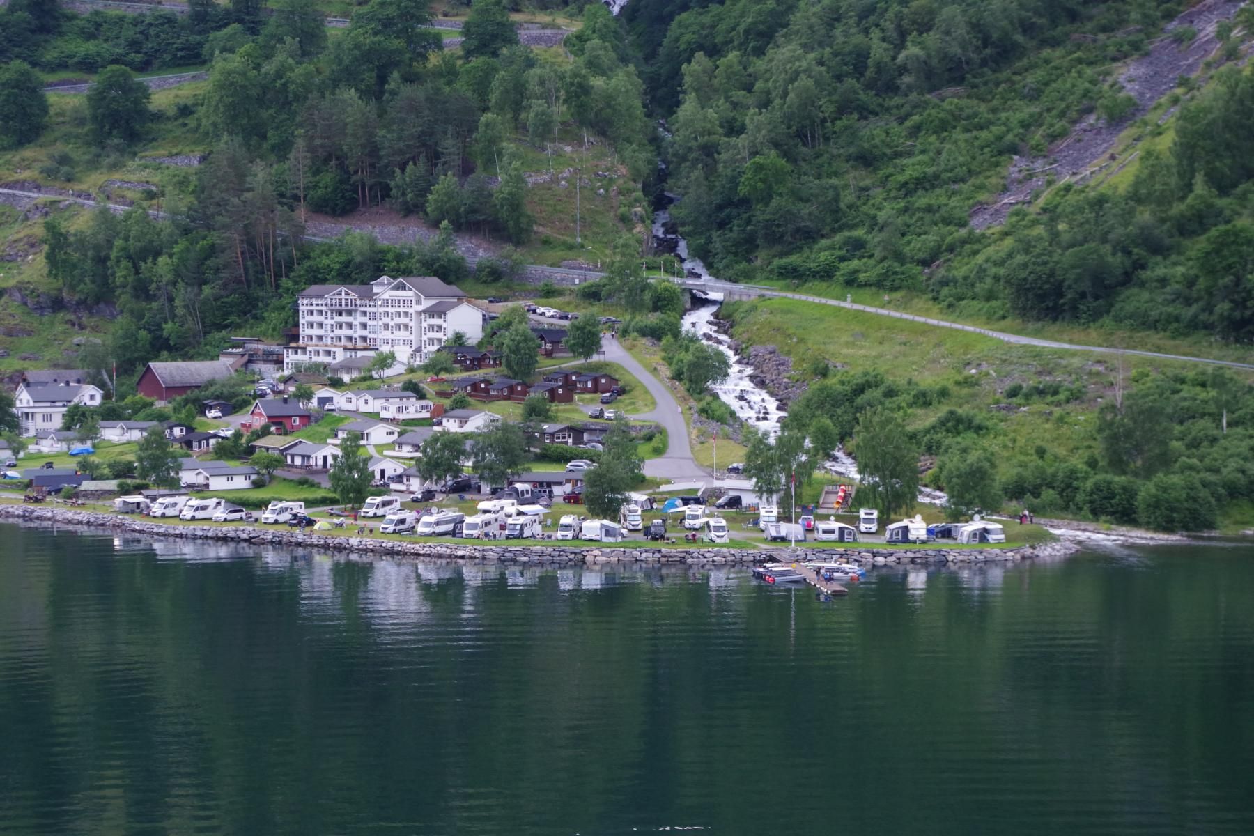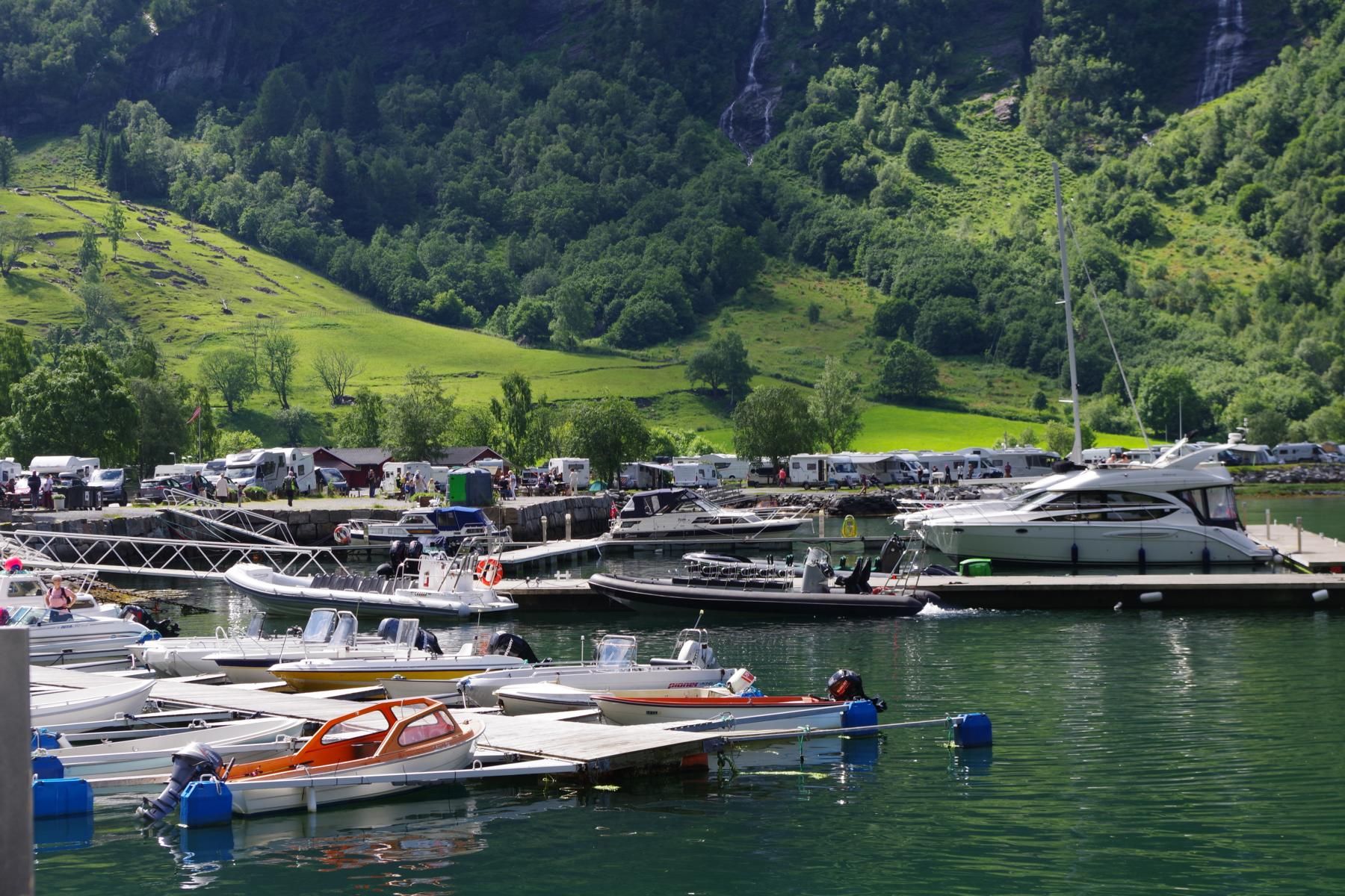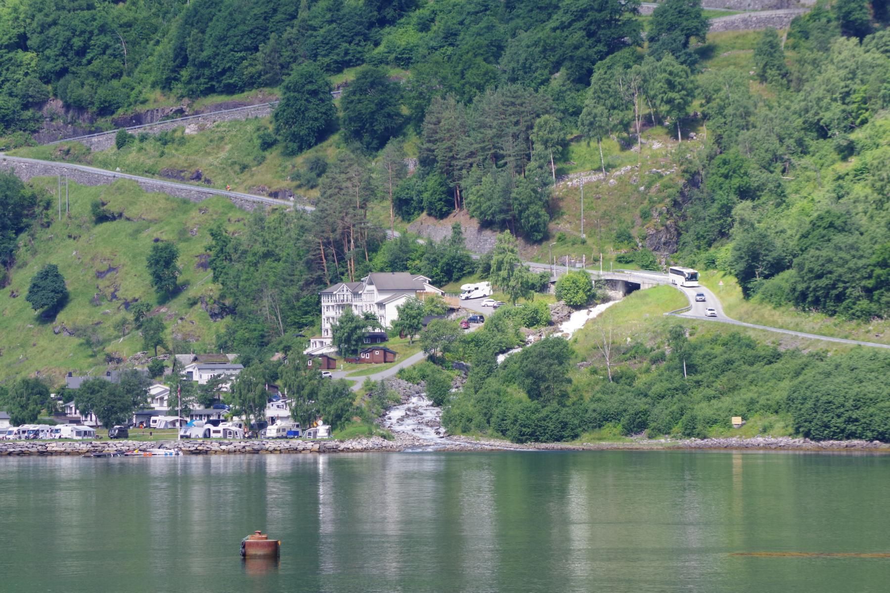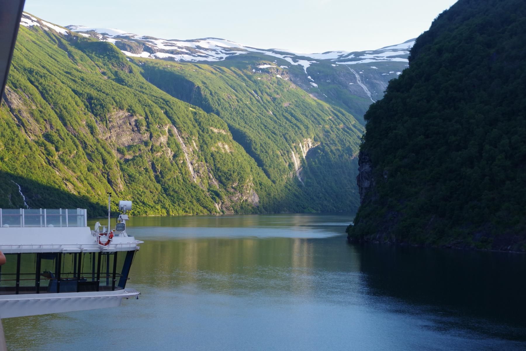 Mit dem Schiff durch den Geiranger ist bei Sonnenschein einfach einmalig schön. Als wir hier vor 23 Jahren mit dem Wohnmobil unterwegs waren, war hier kaum ein anderes Wohnmobil unterwegs und es gab auch nicht den großen Stellplatz in Geiranger. Hier ist alles auf Massentourismus ausgelegt. Den kleinen Campingplatz am Ausgang der Adlerkehre mit dem kleinen Hotel, gibt es aber immer noch.