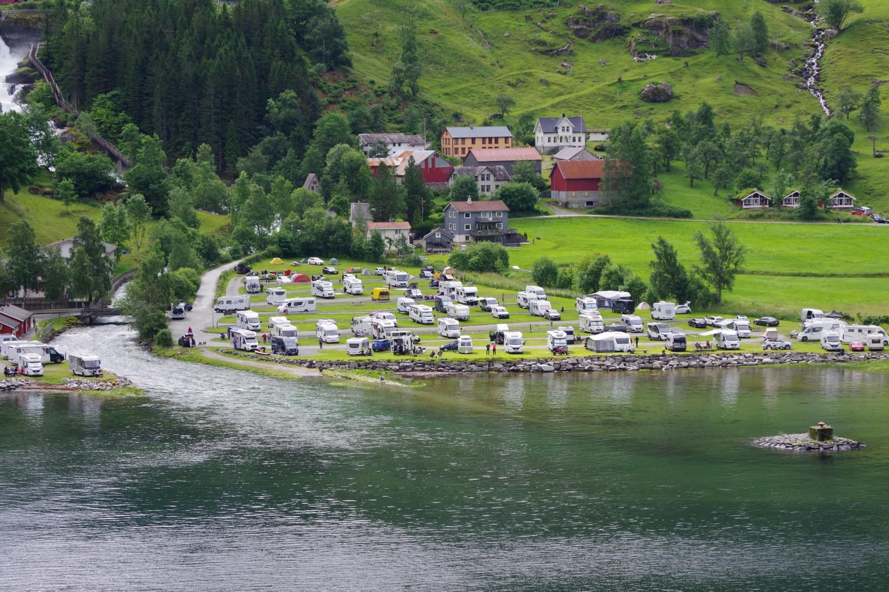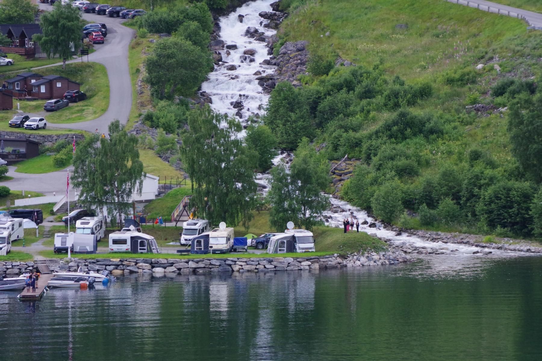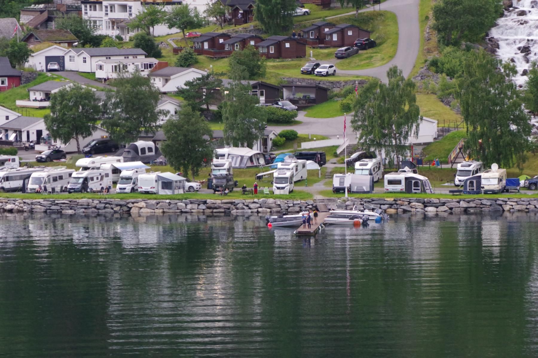 Mit dem Schiff durch den Geiranger ist bei Sonnenschein einfach einmalig schön. Als wir hier vor 23 Jahren mit dem Wohnmobil unterwegs waren, war hier kaum ein anderes Wohnmobil unterwegs und es gab auch nicht den großen Stellplatz in Geiranger. Hier ist alles auf Massentourismus ausgelegt. Den kleinen Campingplatz am Ausgang der Adlerkehre mit dem kleinen Hotel, gibt es aber immer noch.
