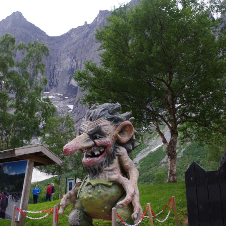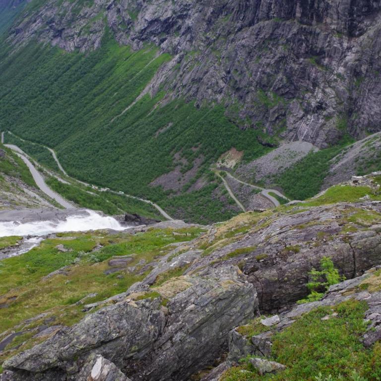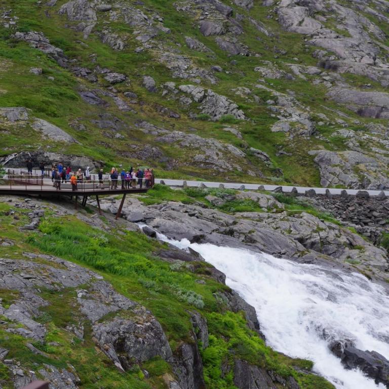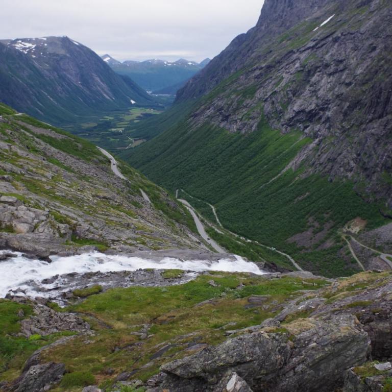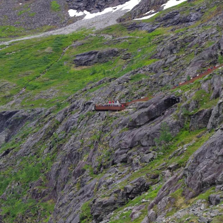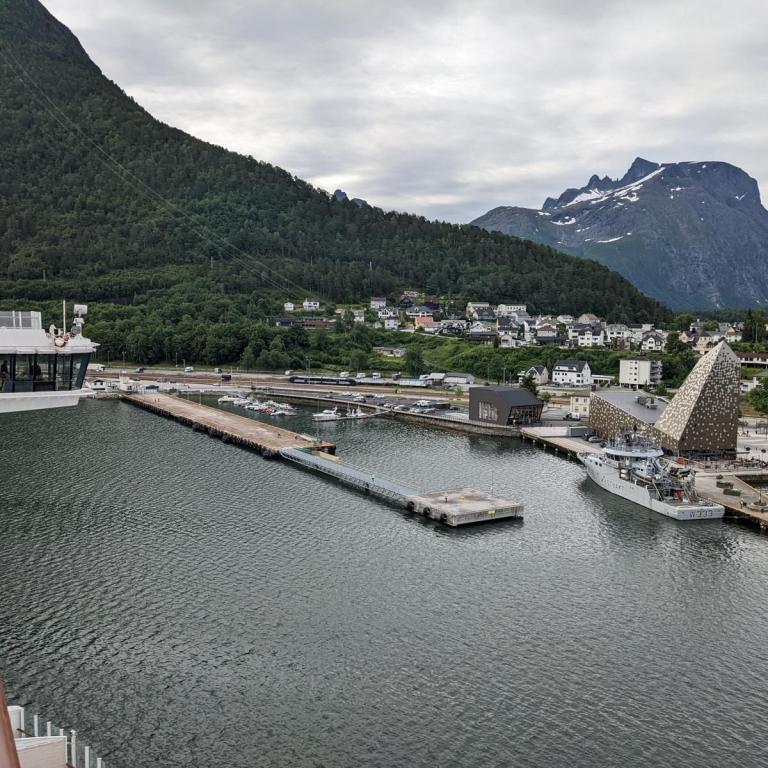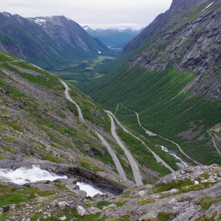 Heute war das Wetter etwas wechselhaft aber bis zur Rückkehr zum Schiff trocken. Die Stadt Andalsnes liegt wunderschön an der Mündung des Flusses Rauma in den Romsdalsfjord, vor der Kulisse schneebedeckter Berggipfel. Um 10 Uhr ging es vom Anleger in Andalsnes mit dem Bus zur Trollwand. Eine gewaltige Felswand wo angeblich die Trolle wohnen. Danach ginge es mit dem Bus die steile Serpentinenenstraße Trollstigen hoch bis zum Aussichtspunkt auf ca. 1000 Meter. Eine Wahnsinns Strecke über 11 Serpentinen. Sehr abenteuerlich aber sollte man unbedingt mal fahren (aber besser nicht mit dem eigenen Fahrzeug).