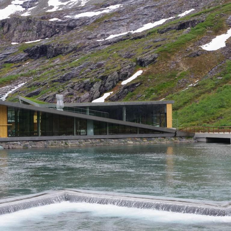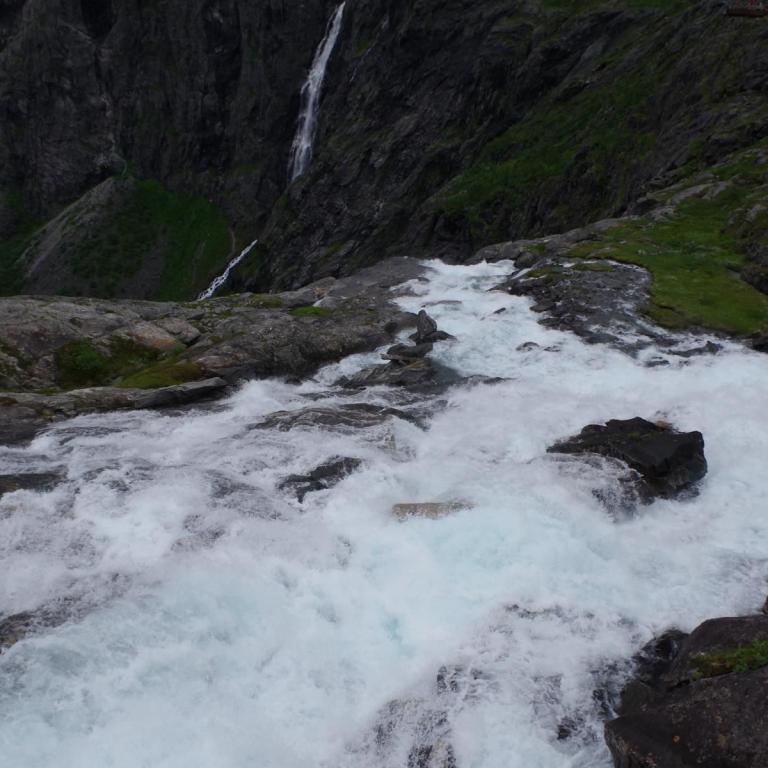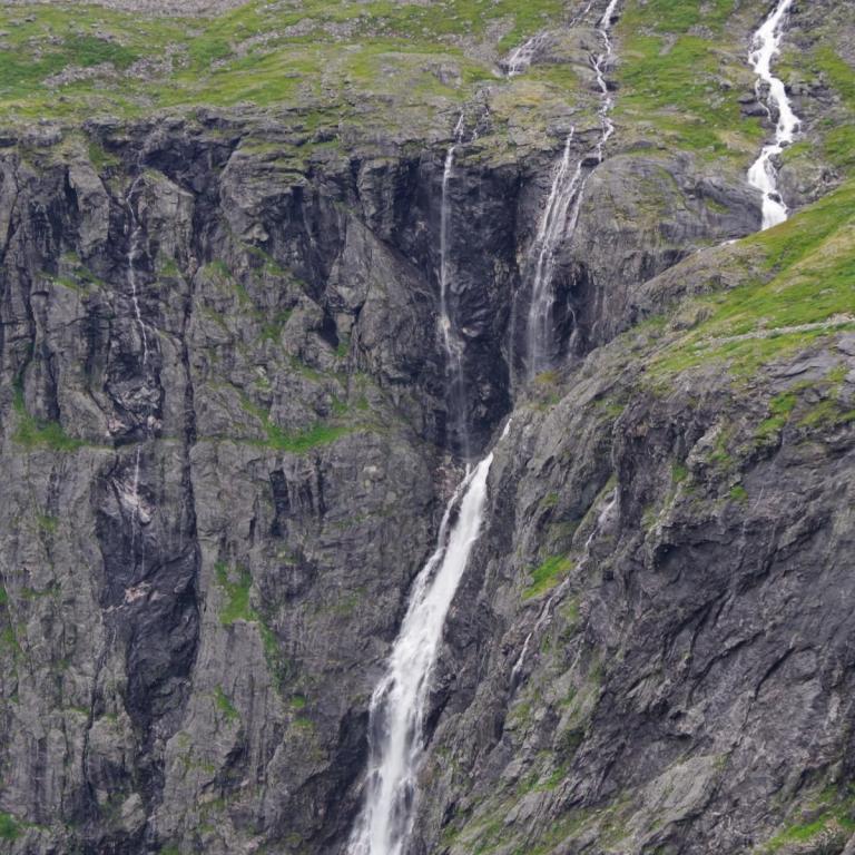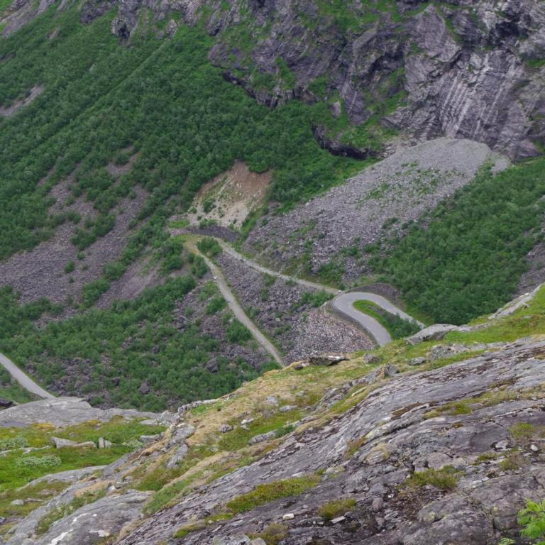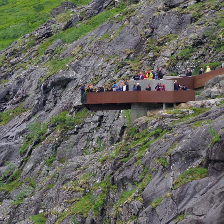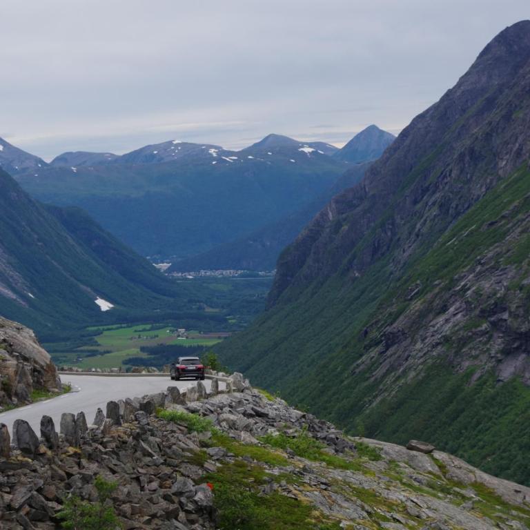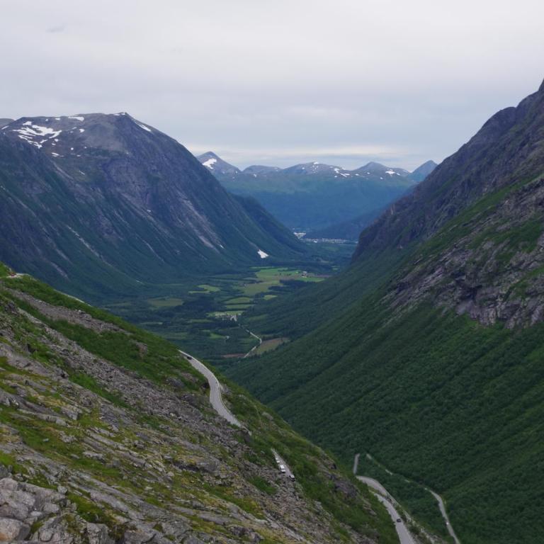 Heute war das Wetter etwas wechselhaft aber bis zur Rückkehr zum Schiff trocken. Die Stadt Andalsnes liegt wunderschön an der Mündung des Flusses Rauma in den Romsdalsfjord, vor der Kulisse schneebedeckter Berggipfel. Um 10 Uhr ging es vom Anleger in Andalsnes mit dem Bus zur Trollwand. Eine gewaltige Felswand wo angeblich die Trolle wohnen. Danach ginge es mit dem Bus die steile Serpentinenenstraße Trollstigen hoch bis zum Aussichtspunkt auf ca. 1000 Meter. Eine Wahnsinns Strecke über 11 Serpentinen. Sehr abenteuerlich aber sollte man unbedingt mal fahren (aber besser nicht mit dem eigenen Fahrzeug).