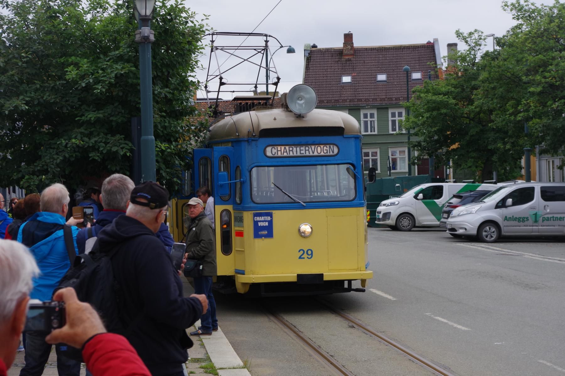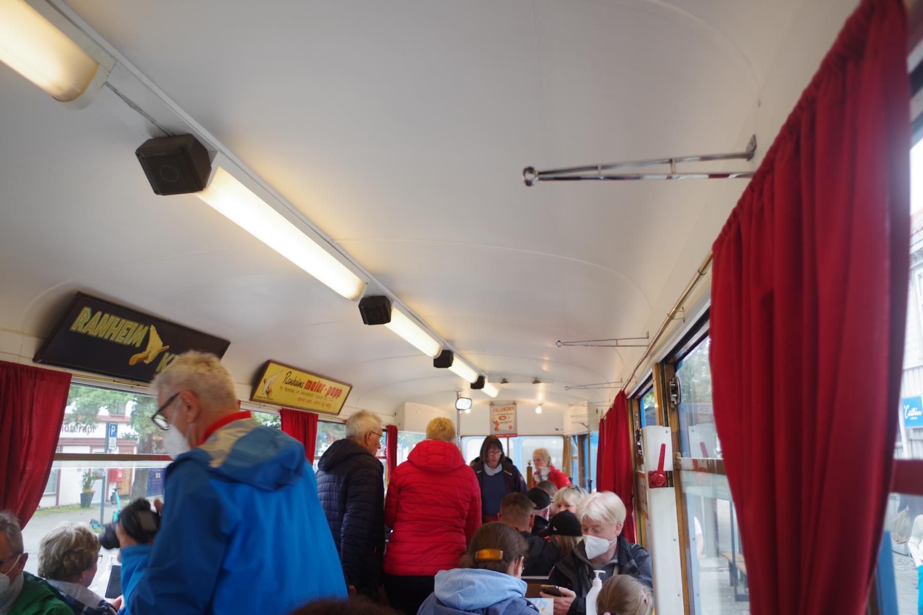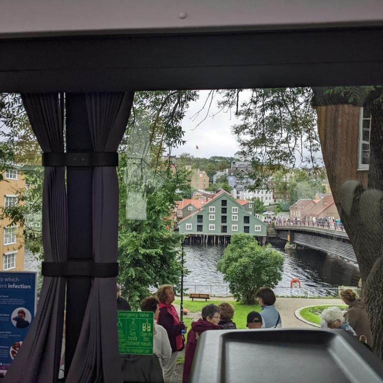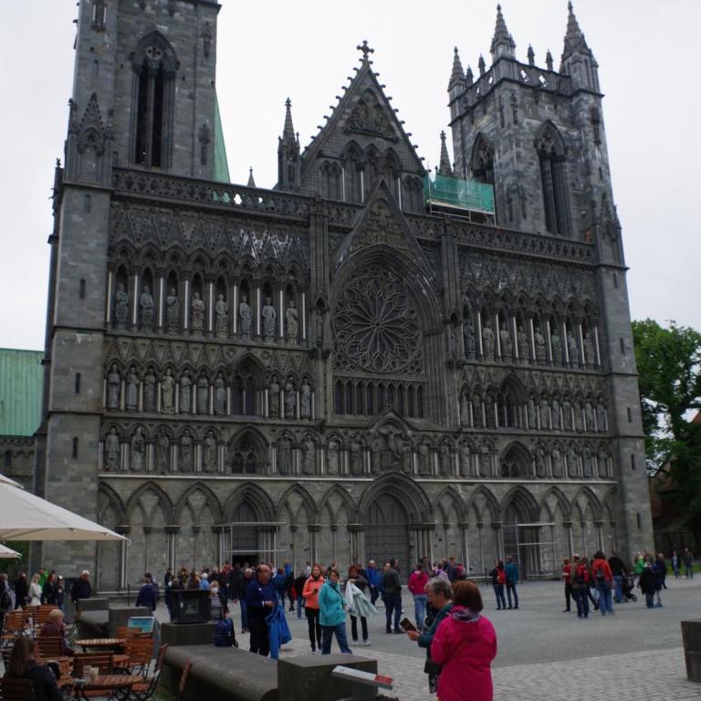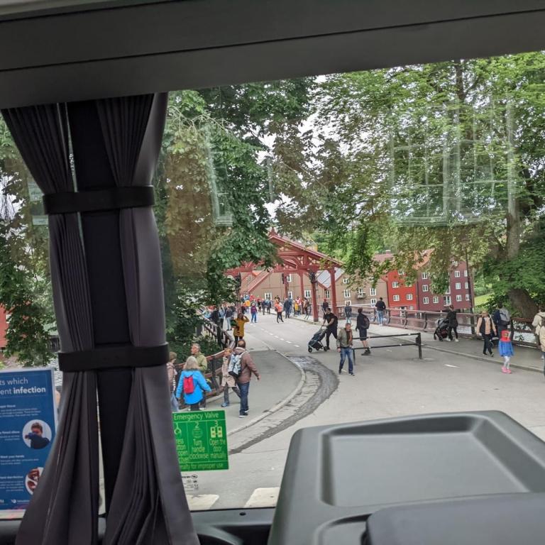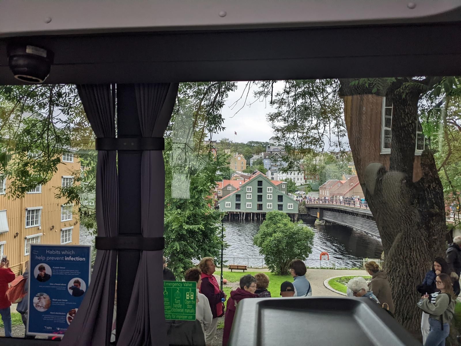 Gegen 07:30 Uhr legten wir in Trondheim an. Das Wetter war ganz ok. Stark bewölkt aber kein Regen. Ideal für einen Ausflug. Um 10 Uhr gings mit dem Bus zur Tramstation. Dort stiegen wir dann in eine historische Tram um. Die Tram wurde trotz Corona mit Gästen vollgestopft, Abstand halten war unmöglich und alle hatten keine Maske auf. Damit fuhren wir dann auf 200 Meter um dort wieder in den Bus umzusteigen. Alles war etwas Chaotisch. Dann ging es mit dem Bus kreuz und quer durch Trondheim mit einigen Fotostopps.