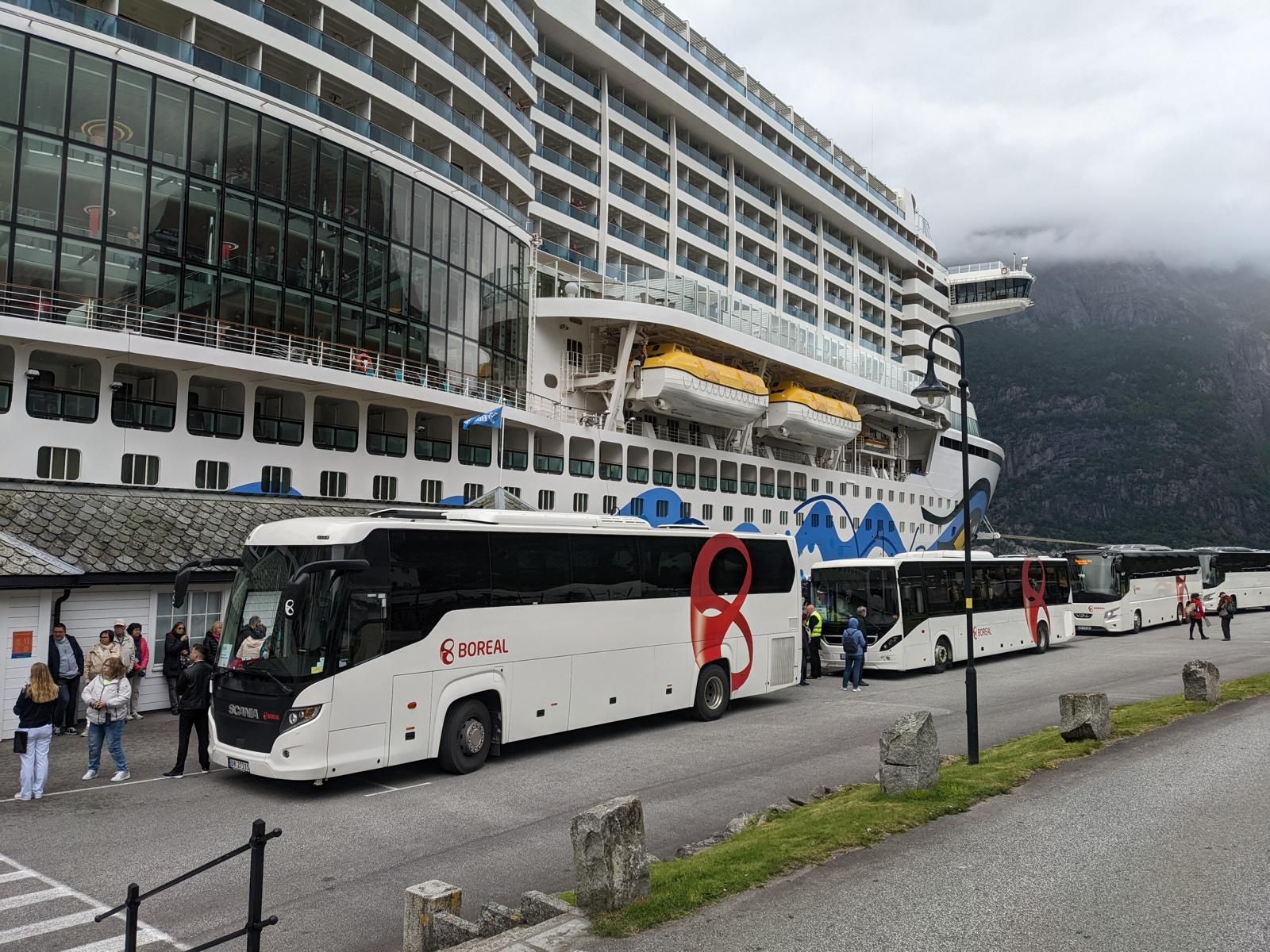 Ankunft in Eidfjord bei Regen und ca. 11 Grad. Waren heute wieder im Buffet Restaurant zum Frühstück. Gestern im French Kiss ist es zwar gemütlicher jedoch bekommt man da das Frühstück zusammengestellt, so das man auch Dinge bekommt welche man gar nicht mag. Die werden dann weggeworfen. Das Essen in der Sushi Bar war übrigens sehr lecker und seinen Preis wert. Nach dem Frühstück ging es gleich zum Bus.