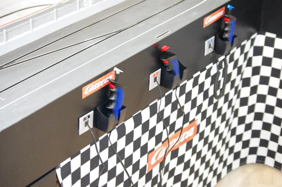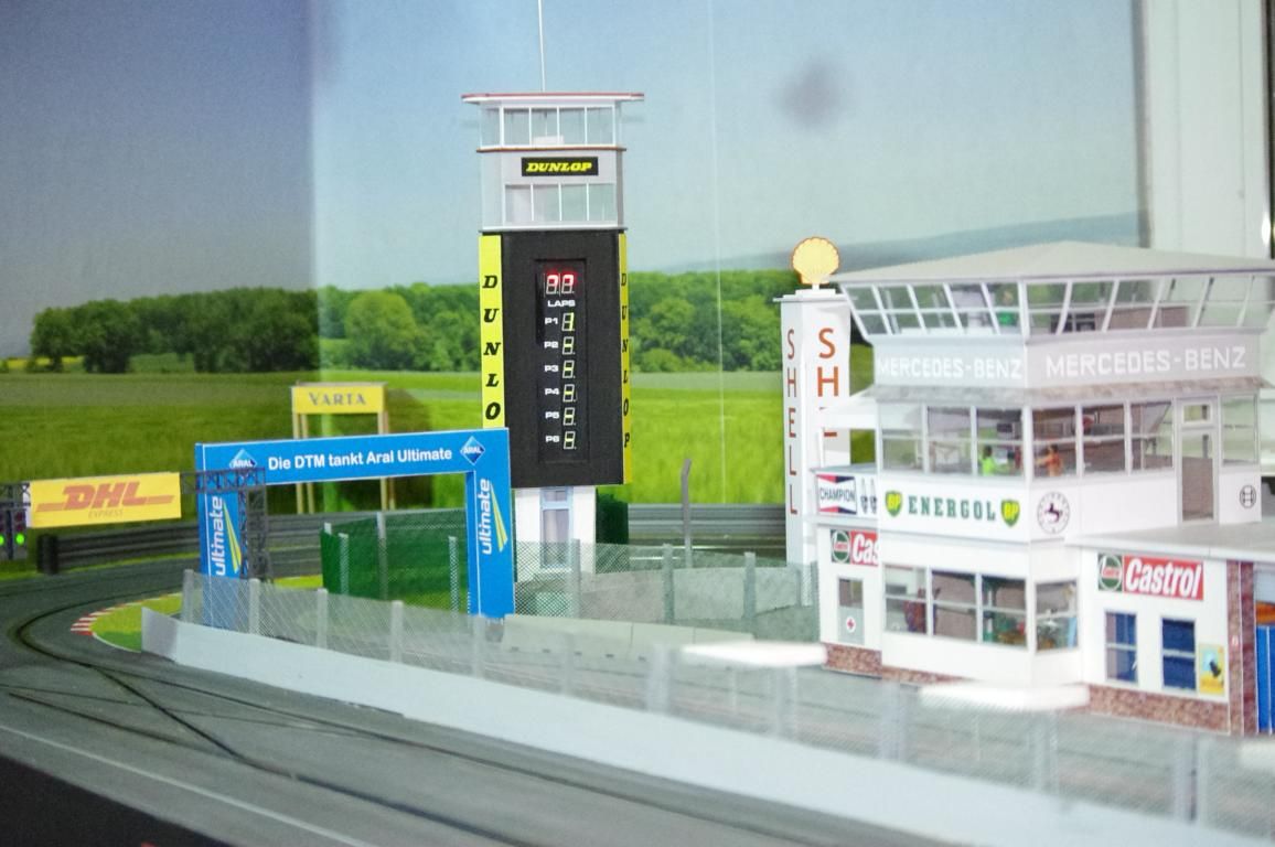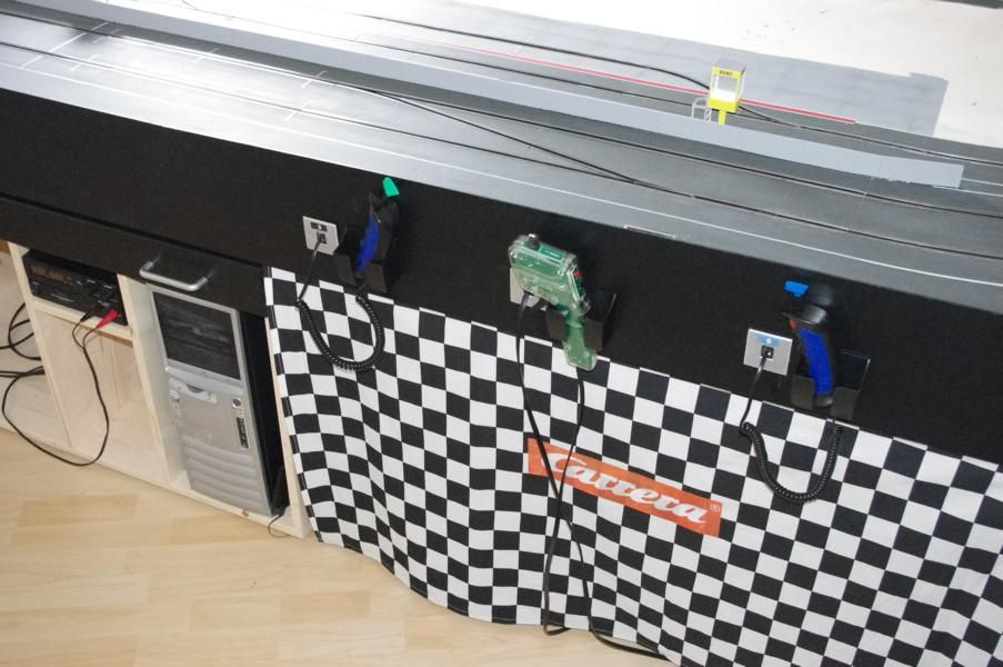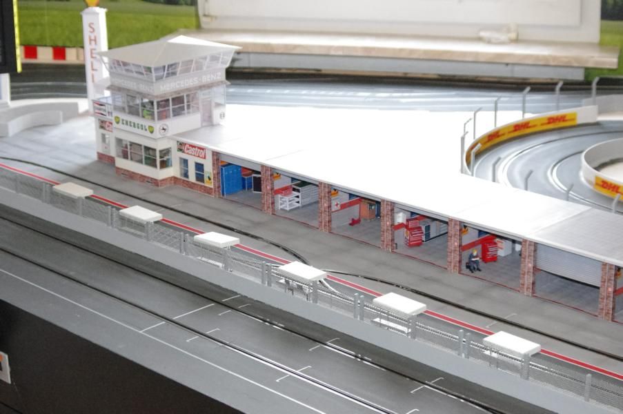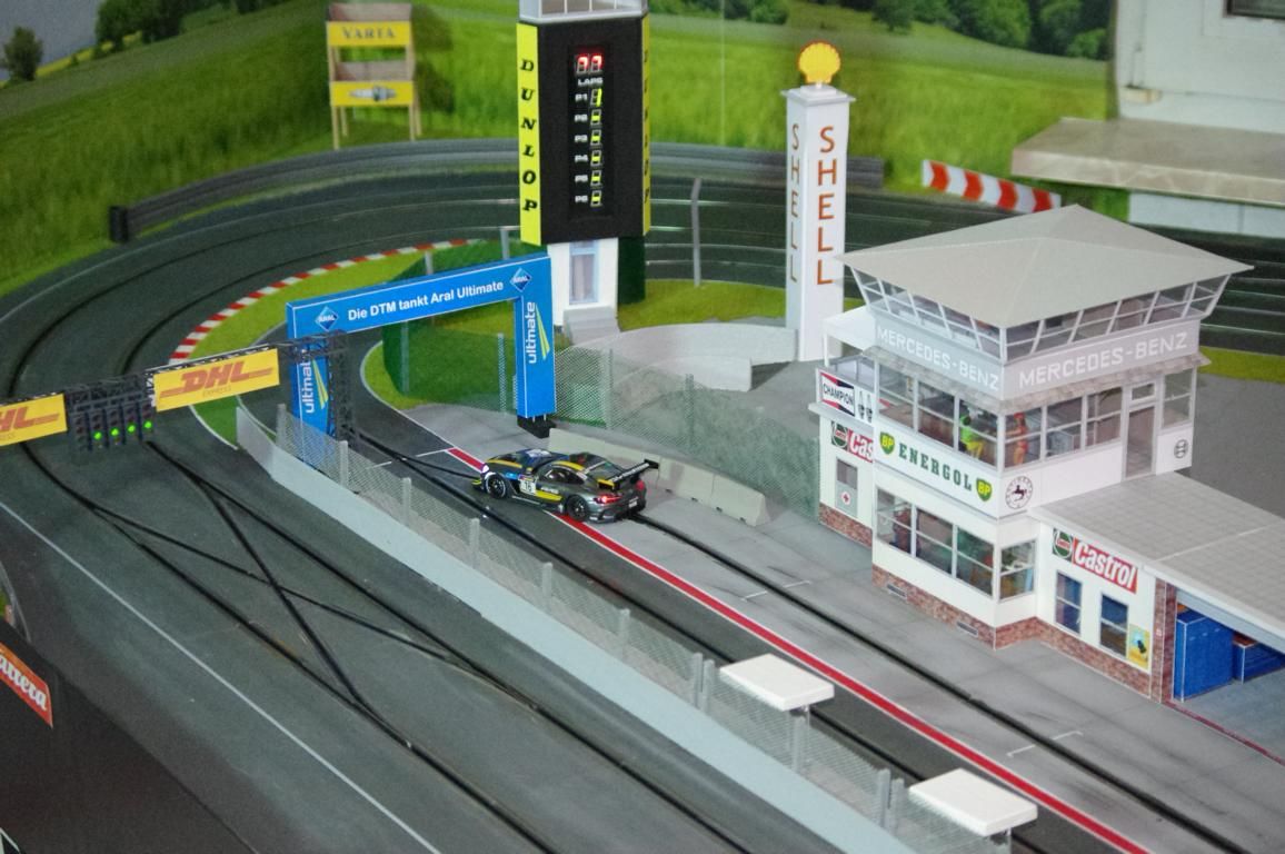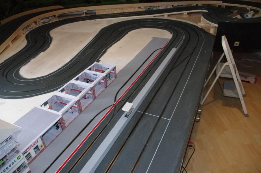 Wieder Zuhause, wurde gleich eine Anfangspackung (Carrera Digital 132 GT-Masters) bestellt. Kaum aufgebaut wuchs die Begeisterung nach mehr. Also erst mal ein Paar weitere Schienen gekauft und weiter ausgebaut. Kurze Zeit später musste noch eine Tankmöglichkeit und Rundenzählung her. Also wurde noch eine Boxengasse und der Rundenzähler besorgt (hätte man sich sparen können, da ja mit der entsprechenden SW viel mehr gemacht werden kann. Das war mir zu diesem Zeitpunkt jedoch noch nicht bekannt).